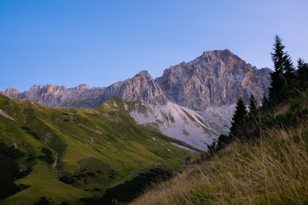 Ab Lehner/Ahrn führt der Weg 818, zwischen Gehrenspitze und Öfelekopf hinauf in das Puitbachtal. Als wir, nach dem anfänglich steilen Aufstieg, aus dem Wald heraus kommen, liegt ein grünes Hochtal vor uns. Nach Norden versperren die steilen Wände von Öfelekopf und Schlüsselkarspitze den Blick in das Wetterstein, nach Süden wird das Tal von der Gehrenspitze eingefasst. Kühe, Schafe und Pferde grasen in der Sonne und ganz am Ende des Tals sieht man schon das Scharnitzjoch, über das uns unsere Tour in Richtung Westen führen wird. Es geht hier kein Wind und die Hitze steht im Tal.