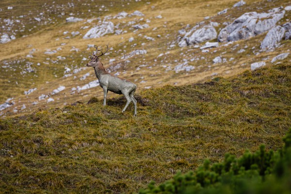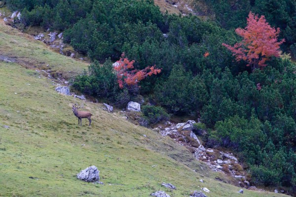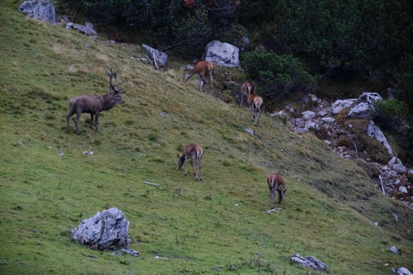 Röhrende Hirsche hatte ich, bis zu diesem Abend im Oktober, noch nie zuvor gesehen. Um ehrlich zu sein, hatte ich in freier Wildbahn überhaupt noch nie irgendwelche Hirsche gesehen. Die imposanten Tiere mit den tiefen, kräftigen Rufen haben mich wahnsinnig beeindruckt wie sie damals aus allen Richtungen über die Bergkämme zusammen kamen. Es ist schon etwas anderes, wenn sich immer mehr Tiere in einem Talkessel einfinden umzu röhren, zu posieren und letzten Endes mit ihren großen Geweihen lautstark aufeinander zu krachen. Als wenn sie ruhig in einem Gehege herumstehen und grasen.