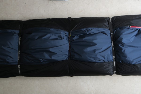 Der Plan war, einen Zwitter aus Arctic-Bedding und Biwaksack zu nähen. Also eine wetterfeste Hülle in der nicht nur Isomatte samt Schlafsack platz haben, sondern eben auch noch ich selbst, wenn ich im Schlafsack liege. Der wasserdichte Zeltboden an der Unterseite hat sich genauso bewährt, wie die atmungsaktive Membran auf der Oberseite. Also bin ich dabei geblieben, habe nur etwas leichtere Materialen gewählt. Der Unterschied: Die Grundfläche muss für die neue Matte größer werden. Und weil die Konstruktion ja später auch bei starken Wind oben auf einer Pulka transportiert werden soll, brauche ich Kompressionsriemen um tagsüber den Oberstoff zu bändigen. Bei einem normalen Arctic-Bedding ist dieser relativ fest und eng, da ja nur Matte und Schlafsack darin Platz finden müssen. Meine Arctic-Biwak-Bedding-Konstruktion bietet aber genug Platz um auch selbst mit hineinzukriechen zu können, ist also weiter und somit flattriger. Eine weitere Besonderheit: An den Ecken und an den Längsseiten habe ich Gurtbänder angebracht um bei Wind am Gipfel alles mit Heringen am Boden fixieren zu können. Mir ist einmal am Gipfel eine Isomatte vom Wind in die Nacht hinaus geweht worden. Seid dem bin ich wohl etwas vorsichtiger geworden.
